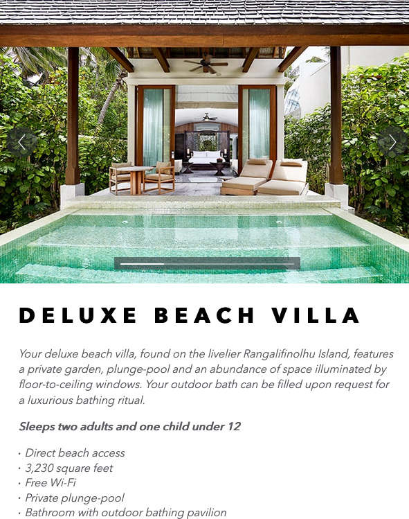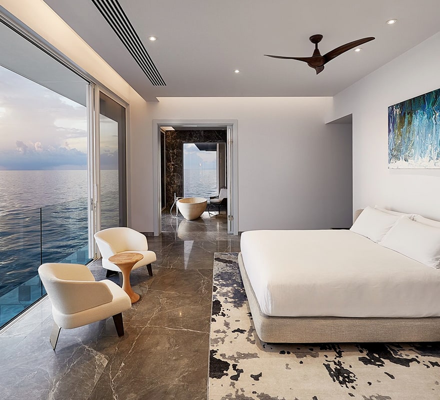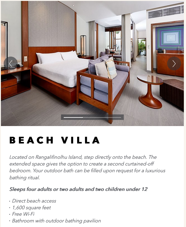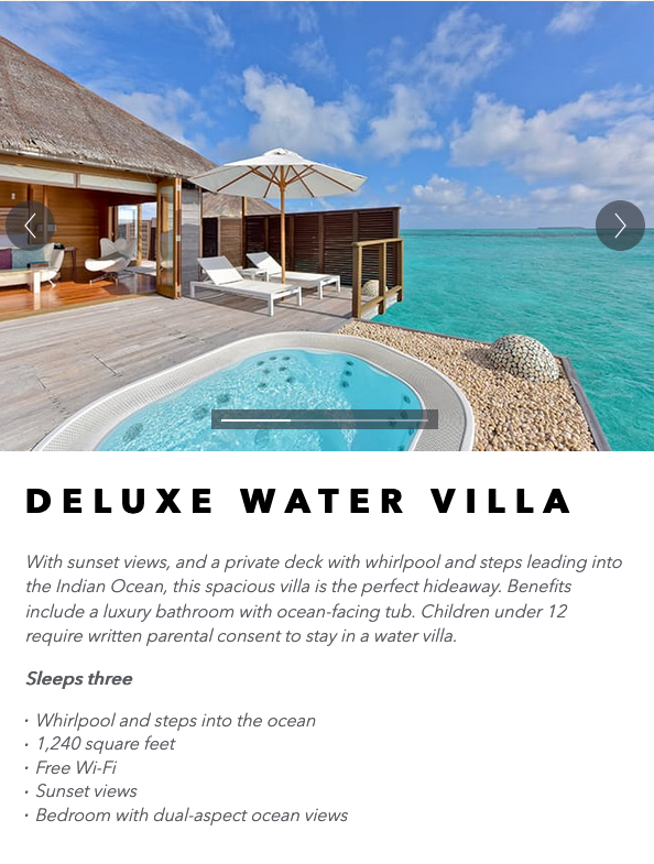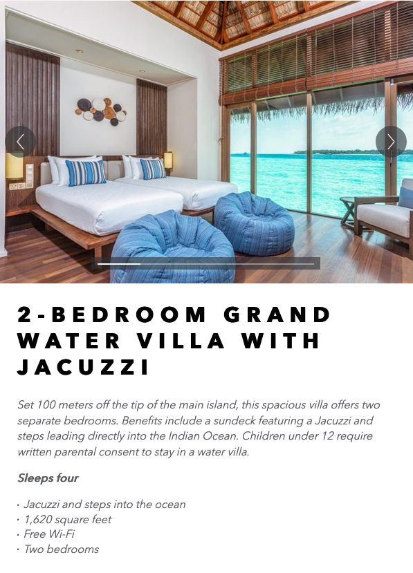 El alojamiento en esta propiedad incluye 50 villas de agua, 79 villas de playa exóticas y 21 fabulosas villas de retiro de agua, lo último en pura indulgencia.