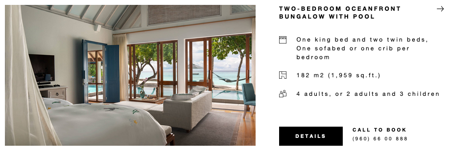 La propiedad consta de 103 bungalows y villas, todas con grandes cantidades de espacio interior y exterior. Cuatro espectaculares restaurantes exhiben comida italiana moderna, cocina libanesa y marroquí, especialidades asiáticas y delicias a la parrilla, mientras que las comidas privadas varían desde "medio océano" hasta un impresionante banco de arena en medio de la nada.
