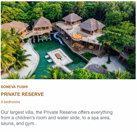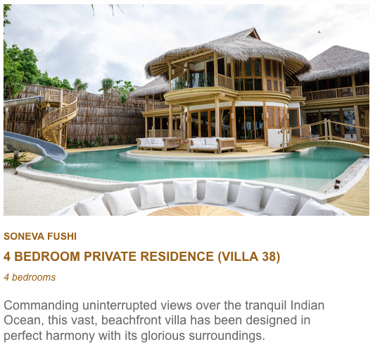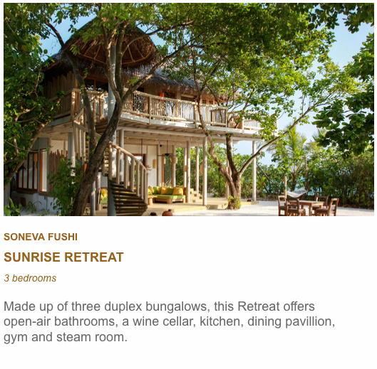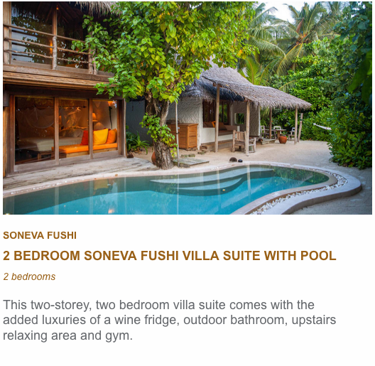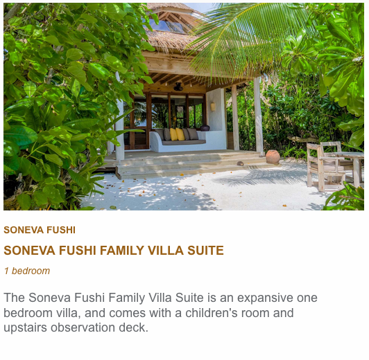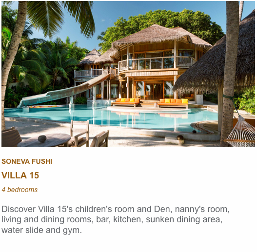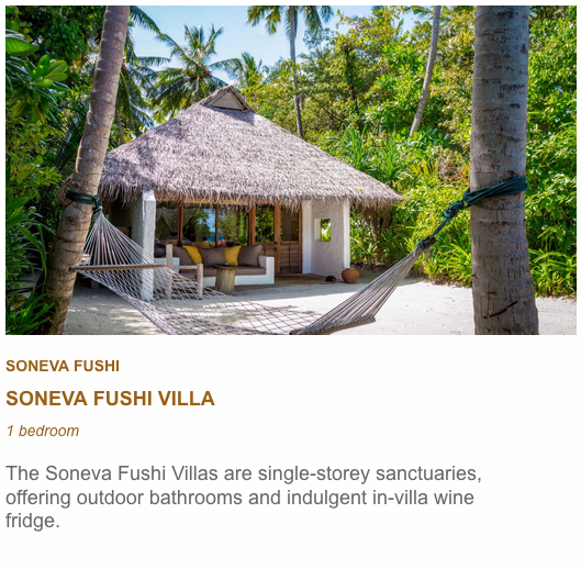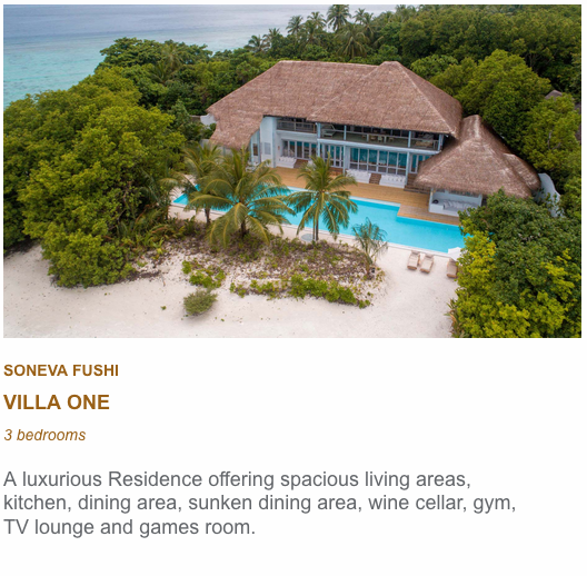 ENAMORADO DE…: Las 9 opciones gastronómicas e incluso una sala de chocolate.La sala de helados con más de 60 sabores de helados frescos caseros.El cine al aire libre proyecta películas clásicasNO PERDERSE: Huerta orgánica de frutas y verduras.Amazing Kids 'Club Glass-making.ESTILO Y CARÁCTER: Los creadores originales del concepto "sin noticias, sin zapatos".UBICACIÓN: Ubicado en la isla de Kunfunadhoo, Baa Atoll, la única Reserva Mundial de la Biosfera de la UNESCO en las Maldivas;y a solo 30 minutos en hidroavión de Malé.EXPERIENCIAS: